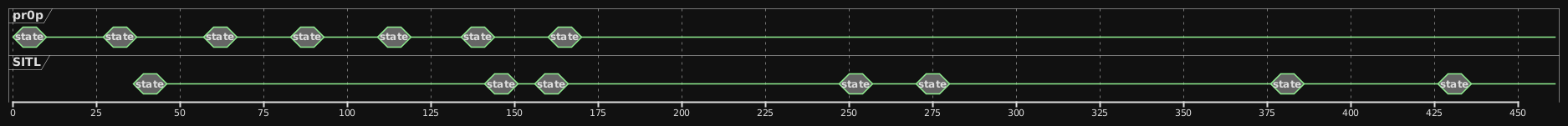 This diagram illustrates pr0p’s simulation updates, which are executed almost simultaneously at a single time point (7 state packets in the first line) due to Unity’s physics simulation running in a simple loop with constant time deltas. Thanks to the rapid response from SITL (first packet in the second line), pr0p is able to incorporate this new data into one of its subsequent state updates. The time scale is in microseconds, and the events were recorded using Wireshark. Notably, the SITL process responds incredibly quickly to pr0p’s initial state update—within approximately 40 microseconds in this specific time window. This near-instant response is achieved by using separate threads for networking on both sides, which actively spin to immediately respond to incoming data.
