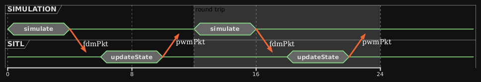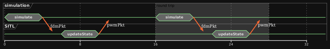 It’s worth noting that while the functions used to demonstrate this timing problem may not take long in practice, they help illustrate the issue. Let’s assume the simulation runs at 60Hz, and the “simulate” function of the simulation process generates a new simulation state (fdmPkt) for the SITL process. The SITL process then receives this data, generates motor outputs (pwmPkt), and sends them back to the simulation process. Once the motor outputs are received, the simulation updates its state in the next step, feeding the new information back to the SITL process, and the loop continues.